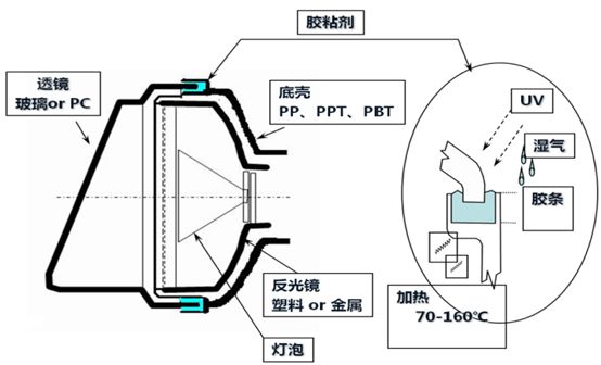汽车车灯作为汽车必不可少的一个组件,在夜间照明、行车信号、雾大防撞、转向标志等方面发挥着重要作用,是汽车安全行驶的重要保障。在汽车车灯制作中,为了将配光镜与灯壳进行密封,必须使用密封胶进行粘接。 在车灯粘接应用中,首先车灯密封胶要受到灯泡发射出来的热量影响,在相应的高温环境下必须保证其粘接和密封性能不发生变化,同时不能释放出有机气体,产生雾化现象,且不发黄,影响外观;其次当车灯密封胶受到太阳光中的紫外线照射时,不会发生胶层龟裂等老化现象,这就要求车灯密封胶需要具有良好的耐紫外老化性能;最后车灯密封胶还会受到水汽、雨水的长时间侵蚀,要保证其密封性能不会因此而受到影响。