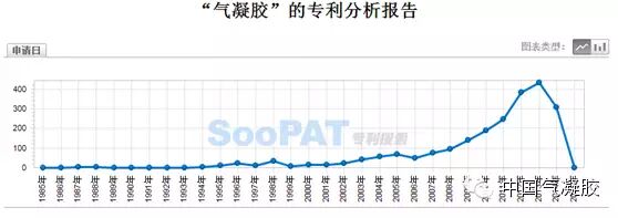 上图是国内气凝胶专利申请数量,可以看到,近年来国内气凝胶研究异常活跃,呈不断上升的趋势(2014年少于2013年应该是由于部分专利尚未公开,未能检索到),从侧面反映出国内气凝胶领域的研究和创新能力在不断增强。