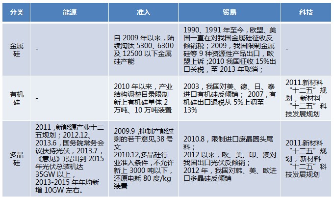 2009年以来,国务院常务会议多次讨论如何引导多晶硅光伏产业健康发展,扶持光伏新能源产业,并先后出台多项文件和优惠政策,大力促进我国光伏装机发展,并从国家层面积极协调我光伏出口遭遇的多起贸易争端。这些举措,都使硅产业的重要性在一定程度上上升到了国家层面。 截至2013年末,适用于硅产业的全国性产业政策主要包括四大类:一是采取反倾销和贸易救济等政策措施确保硅材料、光伏行业的公平贸易;二是通过设置行业准入条件积极引导硅产业转型升级;三是提高光伏新能源安装容量,直接扶持光伏及硅材料产业;四是鼓励硅材料科技创新,重点引导配置科研资源向重点领域倾斜。 近年硅产业重要政策、文件精神