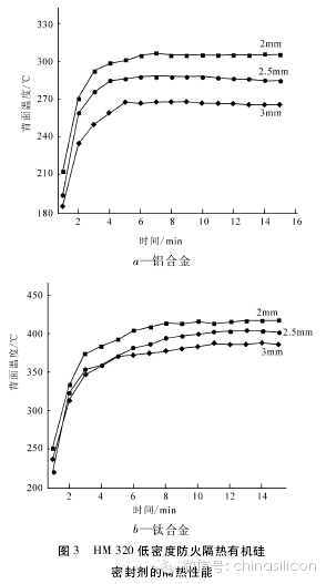 file:///C:/Users/lenovo/AppData/Local/Temp/ksohtml/wpsAF44.tmp.png 图2 经防火试验后的 HM 317 防火阻燃有机硅密封剂 由图 2可见,在高温火焰的作用下,密封剂生成了坚固紧实的炭层,正是这一炭层有效阻止了高温火焰的穿透 。HM 320 低密度防火隔热有机硅密封剂的工作温度为-60 ~204℃,密度为 0. 8 g/cm 3 , 3. 2 mm厚的密封剂经过 1 050 ~ 1 150℃火焰燃烧15 min 不会穿透,并有良好的隔热性能 。 如将厚度为 2. 0 mm、2. 5 mm、3. 0 mm 的 HM 320 密封剂粘接在钛合金和铝合金板上进行防火隔热性能测试,不同厚度的 HM 320 的隔热性能见图 3。 由图3可见, HM 320 具有很好的隔热性能, 即使厚度只有 2 mm 的密封剂也具有优良的隔热效果。