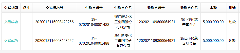 在全国防控疫情的关键时刻,浙江新安化工集团股份有限公司捐赠1000万元现金,通过传化慈善基金会,支持湖北、浙江等地防疫、抗疫工作,其中定向捐赠建德市慈善总会、开化县红十字会各150万元(现金各100万元、防疫物资价值各50万元),用于两地防疫抗疫工作。